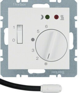 und Fußbodentemperaturfühler, Nennspannung 250 V~, 50/60 Hz, Schaltstrom 10 A, Schalttemperaturdifferenz ca. 1 °C, Nachtabsenkung ca. 5 °C, Fühlerleitungslänge 4 m. Neutralleiter erforderlich!