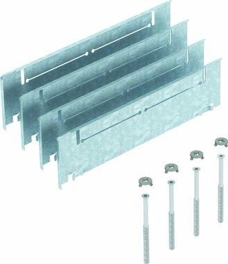 Aufstockhilfe für UZD250-3 mit Nennhöhe 70+55 mm, bestehend aus jeweils 4 Fallblechen, Nivellierschrauben und Verriegelungsdeckeln.