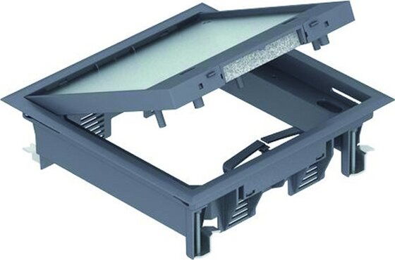 für 4 Standard- (Bauform EKR) oder 6 Modul-45-Installationsgeräte in 2 Gerätebechern GB2 oder Modulträger MT3 für den Einsatz in Kanalsystemen und Doppelböden, Universalbefestigungswinkel einstellbar auf Doppelbodenstärken bis 65mm, Teppichschutzrahmen, Klappdeckel und Schnurauslass aus Polyamid, Bodenbelagaussparung im Klappdeckel 5mm, bei Bedarf auch einstellbar auf 3, 8 oder 10mm