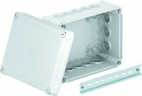 Kabelabzweigkasten zum Verbinden von Kabeln und Leitungen im Innenbereich und geschützten Außenbereichen. Rechteckige Form mit Einsteckdichtungen an den Seiten und Ausschlageinführungen im Boden. Geeignet für die Wand-/ Deckenmontage, die Montage auf Montageblechen und Gewinde im Boden. Mit der Möglichkeit zur Innenbefestigung und Montage über die Eckdome. Hoher Deckel mit Schnellverschluss, plombierbar. Hergestellt aus halogenfreien und UV-stabilisierten Materialien. Inklusive Hutprofilschiene. Kabelabzweigkasten gemäß DIN EN 60670. Flammwidrig nach DIN EN 60695-2-11, Prüftemperatur 650°C. Schlagfestigkeit IK05 gemäß DIN EN 50102.