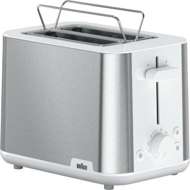 2-Scheiben-Toaster, Brotscheibenzentrierung, Auftaufunktion, Aufwärmfunktion, Brothebefunktion zur leichten Entnahme der Brotscheiben, Stopptaste, Brötchenaufsatz, integriert, Krümelschublade, 900 Watt