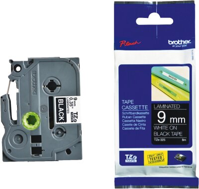 Brother TZ-325. Aufkleberfarbe: Weiss auf Schwarz, Bandtyp: TZ, Produktfarbe: Schwarz. Verpackungsart: Box. Speicherbandbreite (metrisch): 9 mm, Bandlänge: 8 m