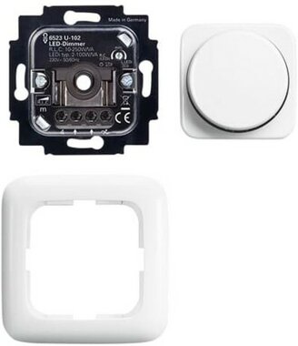 Bestehend aus Busch-LED-Drehdimmer 6523 U-102. Bestehend aus Zentralscheibe mit Drehknopf 2115-214. Bestehend aus Reflex SI-Abdeckrahmen, 1-fach 2511-214.