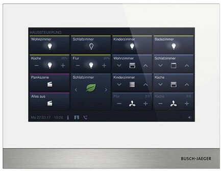 Zentrales Bedienpanel für Busch-Welcome® IP und wahlweise Busch-free@home® oder Busch-Installationbus® KNX. Zur zentralen Steuerung von bis zu 64 konfigurierbaren Busch-free@home® oder Busch-Installationbus® KNX Funktionen vom Typ: Schalten, Dimmen, Jalousie, RTR, Szene, Philips HUE. Hinweis: Die KNX-Anbindung erfolgt mittels KNXnetIP Tunneling. Es wird ein KNX IP-Router oder eine KNX IP-Schnittstelle im System benötigt. Mit integriertem Raumtemperaturregler und Temperaturfühler. Der Raumtemperaturfühler/die Raumtemperaturregelung ist derzeit nur für Anwendungen im KNX freigeschaltet. Für den idealen Anschluss des LAN-Kabels wird bei der Aufputzmontage der Einbau einer Elektronik-Dose empfohlen. Darstellung des Videobildes der Außenstation. Während des Gesprächs kann ein Bild des Besuchers aufgenommen und im Bildspeicher abgelegt werden. Bei Türrufen in Abwesenheit werden automatisch drei Bilder des Besuchers im Bildspeicher abgelegt. Ausgestattet mit einer Hörschleife zur Einkopplung des Audiosignals in Hörgeräte. Unterschiedliche Klingeltöne für Tür- und Etagenruf einstellbar, fünf polyphone Klingeltöne stehen zur Auswahl. Individuelle Klingeltöne (per SD-Karte integrierbar). Lautstärke der Klingeltöne einstellbar. SD-Kartenschacht zur Erweiterung des Bildspeichers. Kapazitives Display mit Glasoberfläche (Auflösung : 1024 x 600). Mit Freisprechfunktion. Freisprechlautstärke einstellbar. Individuelle Audio-Abwesenheitsfunktion. Aufputz- oder Unterputzmontage geeignet (Dose nicht im Lieferumfang enthalten) Zur Unterputzmontage mit 42361F-03 Zur Aufputzmontage mit 42361S-x-03. Zur Einbindung in das myBUSCH-JAEGER Portal. Ermöglicht die Einbindung von Tablet oder Smartphone mit installierter Welcome App als mobile Innenstelle für Audio- und Videokommunikation. Nennstrom: 280mA (24VDC) Stromversorgung über Power-over-Ethernet (PoE) 802.3af. Alternative Stromversorgung über Steckernetzteil 53011PS-03. WLAN (802.11a/b/g/n).