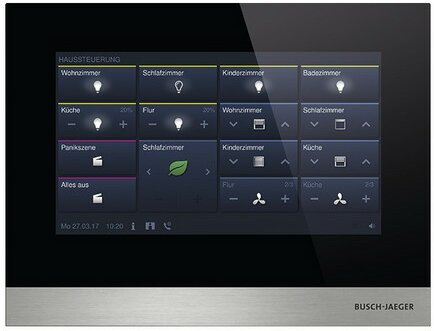Zentrales Bedienpanel für Busch-Welcome® IP und wahlweise Busch-free@home® oder Busch-Installationbus® KNX. Zur zentralen Steuerung von bis zu 64 konfigurierbaren Busch-free@home® oder Busch-Installationbus® KNX Funktionen vom Typ: Schalten, Dimmen, Jalousie, RTR, Szene, Philips HUE. Hinweis: Die KNX-Anbindung erfolgt mittels KNXnetIP Tunneling. Es wird ein KNX IP-Router oder eine KNX IP-Schnittstelle im System benötigt. Mit integriertem Raumtemperaturregler und Temperaturfühler. Der Raumtemperaturfühler/die Raumtemperaturregelung ist derzeit nur für Anwendungen im KNX freigeschaltet. Darstellung des Videobildes der Außenstation. Während des Gesprächs kann ein Bild des Besuchers aufgenommen und im Bildspeicher abgelegt werden. Bei Türrufen in Abwesenheit werden automatisch drei Bilder des Besuchers im Bildspeicher abgelegt. Unterschiedliche Klingeltöne für Tür- und Etagenruf einstellbar, fünf polyphone Klingeltöne stehen zur Auswahl. Ausgestattet mit einer Hörschleife zur Einkopplung des Audiosignals in Hörgeräte. Individuelle Klingeltöne (per SD-Karte integrierbar). Lautstärke der Klingeltöne einstellbar. SD-Kartenschacht zur Erweiterung des Bildspeichers. Kapazitives Display mit Glasoberfläche (Auflösung : 1024 x 600). Mit Freisprechfunktion. Freisprechlautstärke einstellbar. Individuelle Audio-Abwesenheitsfunktion. Zur Unterputzmontage mit 42361F-03 Zur Einbindung in das myBUSCH-JAEGER Portal. Ermöglicht die Einbindung von Tablet oder Smartphone mit installierter Welcome App als mobile Innenstelle für Audio- und Videokommunikation. Nennstrom: 440mA (24V DC) Stromversorgung über Power-over-Ethernet (PoE) 802.3af. Alternative Stromversorgung über Steckernetzteil 53011PS-03.