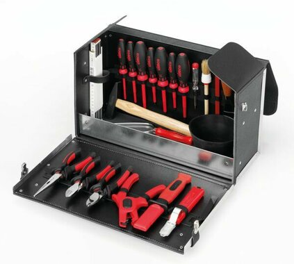 mit 22 Werkzeugen, geräumiger Werkzeugkoffer aus starkem Rindleder, alle Außenkanten mit Aluminium-Winkeln verstärkt, verzinkte, vernietete Blechbodenwanne, Boden und Deckel extra verstärkt, Vorderwand abklappbar mit Dokumenten-Vortasche, Rück-, Vorder- und Seitenwände mit Halteschlaufen. 2 Kabelschneider, 2 Kreuz-Schraubendreher PZ, 2 Kreuz-Schraubendreher PH, 3 Schlitz-Schraubendreher