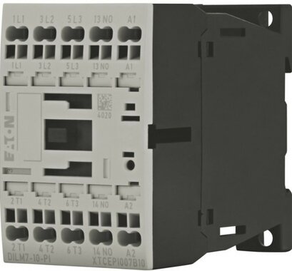 Leistungsschütz für Motoren, Leistungsschütze bis 170 A, 3-polig, Gebrauchskategorie: AC-1: Nicht induktive oder schwach induktive Last, Widerstandsöfen, AC-3/AC-3e: Käfigläufermotoren: Anlassen, Ausschalten während des Laufes, AC-4: Käfigläufermotoren: Anlassen, Gegenstrombremsen, Reversieren, Tippen, Anschlusstechnik: Push-in-Klemmen, Geeignet auch für Motoren der Effizienzklasse IE3, Anzahl der Pole: 3-polig, Bemessungsbetriebsstrom AC-3 380 V 400 V: Ie= 7 A, Bemessungsbetriebsstrom AC-1 konventioneller thermischer Strom, 3-polig, 50 - 60 Hz offen bei 40 °C: Ith = Ie= 22 A, gekapselt: Ith= 18 A, Bemessungsbetriebsstrom AC-1 konventioneller thermischer Strom 1-polig offen: Ith= 50 A, gekapselt: Ith= 45 A, max. Bemessungsbetriebsleistung Drehstrommotoren 50 - 60 Hz AC-3 220 V 230 V: P= 2.2 kW, 380 V 400 V: P= 3 kW, 660 V 690 V: P= 3.5 kW, max. Bemessungsbetriebsleistung Drehstrommotoren 50 - 60 Hz AC-4 220 V 230 V: P= 1 kW, 380 V 400 V: P= 2.2 kW, 660 V 690 V: P= 2.9 kW, kombinierbar mit Hilfsschalter: DILM12-XHI?-PI, DILM32-XHI?-PI, DILA-XHI(V)?-PI, Kontaktbestückung S = Schließer: 1 S, Schaltglieder nach EN 50012., Stromart AC/DC: Gleichstrombetätigung