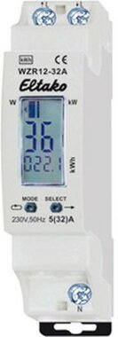 Maximalstrom 32A, Stand-by-Verlust nur 0,5 Watt. Reiheneinbaugerät für Montage auf Tragschiene DIN-EN 60715 TH35. 1 Teilungseinheit =18mm breit, 58mm tief. Dieser Wechselstromzähler mit Reset-Funktion misst die Wirkenergie anhand des zwischen Eingang und Ausgang fließenden Stromes und speichert den Verbrauch in nichtflüchtige Speicher. Wie alle Zähler ohne MID-Konformitätserklärung in Europa nicht für die monetäre Stromabrechnung zugelassen. Die Genauigkeit entspricht wie bei allen Eltako-Wechselstromzählern der Klasse B bei MID (1%), der Anlaufstrom beträgt 20mA. Das Anzeigedisplay ist in 3 Felder aufgeteilt. Feld 1: Diese Anzeige bezieht sich auf den aufgelaufenen Wert in Feld 3. IIII langsam nach rechts laufend = Feld 3 zeigt den aufgelaufenen Verbrauch seit dem letzten Reset. Dies ist die Normalanzeige. S01 = Feld 3 zeigt den Verbrauch letzte volle Stunde bis S24 = vor 24 Stunden. T01 = Feld 3 zeigt den Verbrauch letzter voller Tage bis T95 = vor 95 Tagen. Feld 2: Momentanwert des Stromverbrauches (Wirkleistung) in Watt (W) bzw. Kilowatt (kW). Die Anzeigepfeile links und rechts zeigen die automatische Umschaltung W und kW an. Feld 3: Aufgelaufener Wert bis 9999 kWh. Anzeige bis 9,999kWh mit 3 Nachkommastellen, ab 10kWh mit 1 Nachkommastelle und ab 1000kWh ohne Nachkommastelle. Mit der linken Taste MODE wird in den Anzeigemöglichkeiten geblättert und diese werden im Feld 1 angezeigt: S01 und T01 wie oben beschrieben. Zuletzt folgt mit Drücken von MODE das Landeskürzel der eingestellten Sprache. D für deutsch, GB für englisch, F für französisch und ES für spanisch. Mit der rechten Taste SELECT wird innerhalb der Anzeigemöglichkeiten mit jedem Drücken die angezeigte Zahl um 1 erhöht und der entsprechende Wert im Feld 3 gezeigt. Aus der letzten vollen Stunde wird so die vorletzte Stunde usw. Wurde mit MODE die aktive Sprache gewählt, so kann mit SELECT auf eine andere Sprache umgeschaltet werden. Wird die neue Spracheinstellung mit MODE verlassen, ist diese aktiv. 20 Sekunden nach der letzten MODE- bzw. SELECT-Betätigung und wenn beide Tasten kurz gleichzeitig gedrückt werden, springt das Programm automatisch in die Normalanzeige zurück. Reset: Die Tasten MODE und SELECT gleichzeitig 3 Sekunden gedrückt halten, bis RES im Feld 1 erscheint. Wird nun SELECT kurz gedrückt, werden alle Speicher auf Null gesetzt. Danach kehrt das Programm automatisch in die Normalanzeige zurück.