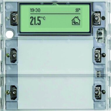 System 55, Gira E22 Grafik-Display mit Hintergrundbeleuchtung und vielfältigen Anzeigemöglichkeiten (Temperatur, Uhrzeit, Datum, Alarm und Hinweistexte), mehrfarbige Status-LED (rot, grün, blau) über die ETS parametrierbar, zwei Status LED je Bedienfläche, Beschriftungsfeldbeleuchtung, integrierter Temperatursensor zum Messen und Weiterleiten der lokalten Raumtemperatur, Montage auf Busankoppler 3, Projektierung und Inbetriebnahme erfolgt ab ETS3.0d Patch A, Demontageschutz durch Verschraubung, inkl. neutraler Beschriftungsfelder