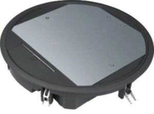 Versorgungseinheit R12 rund 306mm für 5mm Bodenbelag aus Polyamid tiefschwarz.Versorgungseinheit nach DIN EN 50085-1 und DIN EN 50085-2-2, inklusive Universal-Befestigungsset, mit Belagschutzrahmen, Gerätebecher stufenweise bis 18 mm absenkbar, mit Anschlussmöglichkeit für Flachkette.