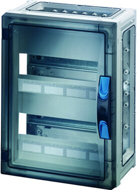 für Geräte bis 63 A, mit PE- und N-Klemmen, Türverschluss mit Handbetätigung, Verschlussplatten und Anbauflansche separat bestellen