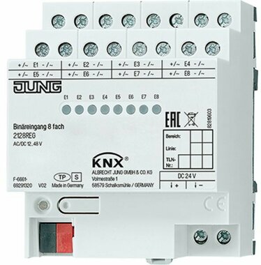 REG-Gehäuse 4 TE 8 Eingänge 12 ... 48 V AC/DC Hilfsspannungsausgang DC 24 V (SELV) zur Abfrage potentialfreier Kontakte mit Statusanzeige ETS-Produktfamilie Eingabe Produkttyp Binäreingang 8fach Bestimmungsgemäßer Gebrauch Abfrage konventioneller Schalt- oder Tastkontakte, Fensterkontakte etc. in KNX-Anlagen zum Melden von Zuständen, Zählerständen, Bedienen von Verbrauchern etc. Montage auf Hutschiene nach DIN EN 60715 in Unterverteiler Produkteigenschaften Status-LED für jeden Eingang Erkennen von Spannungspegeln und -wechseln am Eingang Senden des Eingangszustandes auf den Bus Sendeverhalten frei einstellbar Funktionen: Schalten, Dimmen, Jalousien auf/ab, Helligkeitswerte, Temperaturen, Abrufen und Abspeichern von Szenen Eingänge separat sperrbar Anschluss externer Wechsel- und Gleichspannungen möglich Hilfsspannungsausgang für Abfrage potentialfreier Kontakte Keine separate Spannungsversorgung notwendig Separate Bezugspotentiale für Eingänge Impulszählung (ab Firmware-Version V02), auch für S0-Impulse geeignet