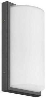Wandleuchte aus Aluminium-Druckguss, pulverbeschichtete Blende in der Farbe Graphit, Diffusor aus Opalglas, innenliegender Bewegungsmelder ist für LED-Leuchtmittel bis max. 13 W geeignet, Reichweite bis 8m, Fassung E27, IP44