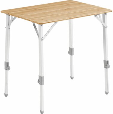 Schöner Bambustisch mit langlebiger Bambustischplatte und Aluminumrahmen. Öffnet und schließt sich in Sekunden. Mit praktischen Handgriffen für einen einfachen Transport. Teleskop-Beine für eine einfache Höhenverstellung. Für kurze Dauer wetterbeständig. Durch das geringe Packmaß sind die Größen S und M ideal für Campervans.