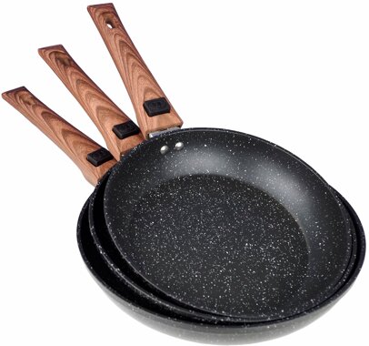 3-tlg. Pfannen-Set mit abnehmbarem Griff in Holzoptik. Geeignet für Induktionskochfelder. Pfannengrößen: ø 22 cm, ø 24 cm, ø 26 cm.