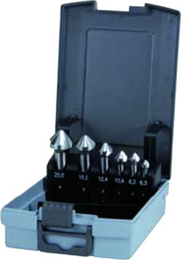 6-teilig. In schlag- und bruchfester ABS-Box. 90° 3-Schneiden. HSS (DMO5) - Stahl. Härte am Schneideteil = 64±1 HRC / Härte am Schaft min. 45 HRC. CBN-geschliffener Kegel- und Entgratsenker. Für alle gängigen Industriematerialien. Z. B.: Nichteisen-Metalle, Edelstahlbleche, thermoplastische und duroplastische Kunststoffe sowie alle gängigen Stahlbleche.