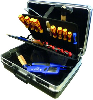 2-seitige Werkzeugtafel mit Einsteckfächern und integriertem Dokumentenfach, ABS-Einsatzschale inkl. Abdeckplatte mit Einsteckfächern, Inhalt: VDE Schlitz-Schraubendreher 2,5 x 75 mm, 3,5 x 100 mm, 5,5 x 125 mm, 6,5 x 150 mm VDE Kreuzschlitz-Schraubendreher PH1, PH2, PZ1, PZ2 VDE Abisolierzange 160 mm, VDE Kombizange mit Schneide, VDE Kraft-Seitenschneider 160 mm, VDE Rundzange 160 mm, VDE Flachzange 160 mm, Abisoliermesser Taschensäge PUK, Flachmeißel 250 mm, Elektrikermeißel 250 mm, Schlosserhammer 300 g, Handfäustel 1.250 g Ringpinsel, Gipsbecher 0,73l, Maler- Elektrikerspachtel 40 mm 2-pol. Spannungsprüfer, Kontaktloser Spannungsprüfer, Zimmermannsbleistift 240 mm Innenmaße: 460 x 315 x 169 mm Max. Belastung: 25 kg