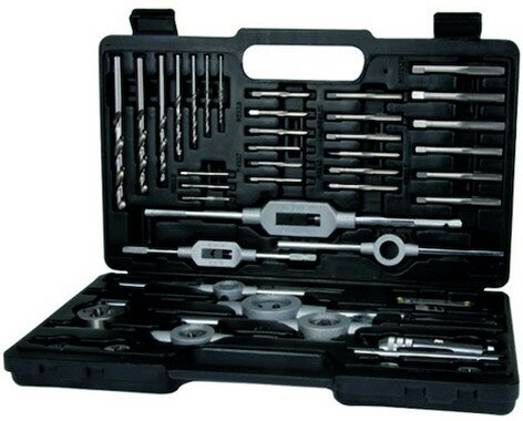45-tlg. Gewindeschneidwerkzeug-Satz in Kassette, Alle Bohr- und Gewindewerkzeuge komplett aus hochlegiertem Werkzeugstahl HSS gefertigt. Komplettsatz für metrisches Gewinde M 3 - M 12 nach DIN ISO 13 je ein 3-tlg. Satz Handgewindebohrer DIN 352 HSS geschliffen, M 3 - M 4 - M 5 - M 6 - M 8 - M 10 - M 12, + je 1 Schneideisen DIN EN 22568 HSS geschliffen, M 3 - M 4 - M 5 - M 6 - M 8 - M 10 - M 12, + je 1 Schneideisenhalter DIN 225, 20 x 5 / 20 x 7 / 25 x 9 / 30 x 11 / 38 x 14 mm, + 7 Spiralbohrer DIN 338 Typ N HSS-G, Ø 2,5 - 3,3 - 4,2 - 5,0 - 6,8 - 8,5 - 10,2 mm, + je 1 Windeisen Gr. 1 DIN 1914, + je 1 Windeisen Gr. 2 DIN 1914, + 1 Stahlwerkzeughalter Gr. 1, + 1 Schraubendreher, + 1 Gewindeschablone,