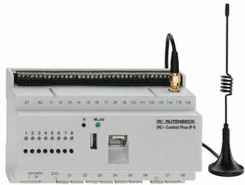 R-Control Plus IP 8, mit Netzwerkanschluss und integriertem WLAN-Accesspoint, im REG-Gehäuse (8TE), - integrierte Spannungsversorgung 230 V, - 8 Schaltausgänge 16 A/230 V, - Schaltausgänge parametrierbar als Rollladenausgänge (max. 4), - Zustandsanzeige der Schaltausgänge, - lokale Bedienung der Schaltausgänge, - integrierte Jahreszeitschaltuhr, - 2 A/D-Eingänge für Sensoren 0-10 V/4-20 mA, parametrierbar, - 16 digitale Eingänge für potentialfreie Kontakte, - umfangreiche Logikfunktionen zur Verknüpfung aller Eingangsparameter, - vorbereitete Szenen wie "Alles Aus/Ein", Anwesenheitssimulation uvm., - 3 benutzerdefinierte Szenen frei definierbar, - Einfach-Konfiguration per Webbrowser, - Netzwerkanschluss RJ45, - Link- und Aktivitätsanzeige für den Netzwerkanschluss, - integrierter WLAN-Accesspoint (IEEE 802.3 b/g/n, 150 Mbit/s), - WLAN-Antenne mit 2 m Zuleitung im Lieferumfang, - Kontroll LED für WLAN, - frontseitige USB2.0-Schnittstelle für LTE/GSM-Stick, - frontseitiger Reset-Knopf, - Zugriffsschutz durch Passwörter, - amazon alexa- und Google Home-Anbindung mit Zusatzhardware (AppModul), - plattformübergreifende Bedienung über Webbrowser, - SmartPhone Bedienung per kostenloser App (iOs/Android), - UDP-Protokollsteuerung aller Funktionen/Parameter, - manuelle Adressvergabe oder dynamisch über DHCP, - Bedienoberfläche in den Sprachen D/GB/NL/F, - lichtgrau (ähnlich RAL7035), - Schutzart IP20 gem. EN60529
