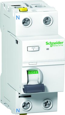 iID Typ A pulsstromsensitiv, stoßstromfest bis 250 A (selektiv s: 3 kA), Kurzschlussfestigkeit: 10 kA mit Vorsicherung 100 A (In = 63?80 A) bzw. 80 A (In = 16?40 A), Doppelanschlussklemme für Steg-Phasenschiene und Kabel: 35 mm² (starr) und 25 mm² (flexibel), Querverschienung mit Leitungsschutzschalter iC60 möglich, Montage von elektrischen Zusatzeinrichtungen seitlich möglich