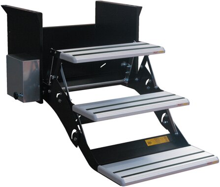 Die Einstiegsstufe funktioniert elektronisch und überwindet mit ihren 3 Stufen eine Höhe von 80-90 cm. Sie eignet sich bestens für das Besteigen von sehr großen Fahrzeugen. Es enthält eine multifunktionale Steuereinheit zur vollständigen Steuerung aller Stufenfunktionen.