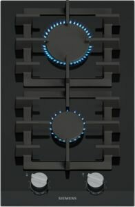 Domino-Gaskochfeld mit Glaskeramik- Oberfläche und stepFlame-Technologie zur präzisen Steuerung der Flamme, abnehmbaren Schwertknebeln und spülmaschinengeeigneten Topfträgern.