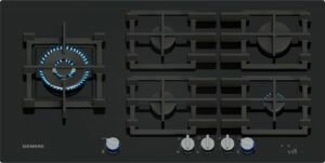 Gaskochfeld aus Hartglas mit stepFlame-Technologie für eine präzise Steuerung der Flamme, intelligenter Dunstabzugsautomatik, abnehmbaren Schwertknebeln und halbdurchgehenden Topfträgern für eine mühelose Reinigung.