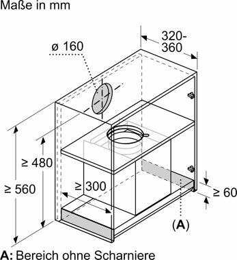 - Einbaumaße (HxBxT): min. 340 mm x 860 mm x min. 300 mm