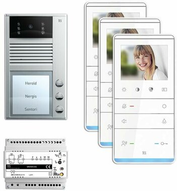 Vorkonfiguriertes Paket für 3 Wohneinheiten für den TCS:BUS bestehend aus: 1x Außenstation VPAK Color V2D 3Tasten AP EN, Artikelnummer: AVC12030-0010, vorprogrammiert, 3x TASTA V2D 3,5 Zoll Freispr. AP WS/WS, Artikelnummer: IVW5211-0145, 1x Video-2-Draht:BUS Versorgungsgerät, Artikelnummer: NVV1000-0400, Das Paket ist ab Werk vorkonfiguriert und bedingt erweiterbar, Die Funktionen der Innen- und Außenstationen können mit TCS-Serviceprodukten bedingt verändert werden, Die Komponenten unterstützen einen stand-alone-Betrieb