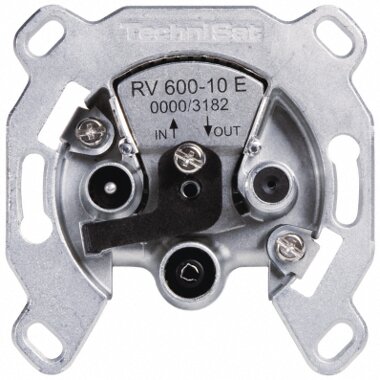 Die Antennensteckdose RV 600-10 E verfügt über eine integrierte Elektronik und erfüllt die europäischen Normen EN 50083-1 und EN 50083-2. Aufgrund ihres zweifachen Gleichspannungsdurchlasses (doppelter DC-Bypass) ist sie die ideale Reihenverteilkomponente in TechniRouter-Systemen.