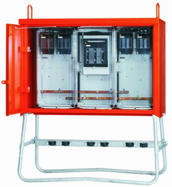Gruppenverteiler, Anschlussleistung: 173kVA, nach IEC/EN 60439-4/A1+A2 (DIN/VDE 0660 T501/A1+A2), Gehäuse (E28) aus elektrolytisch-verzinktem Stahlblech mit schwermetallfreier Kunststoff-Lackierung, Farbe: RAL 2004 -reinorange-, mit Kranösen, mit Doppeltür und 3-Punkt Stangenschloss, mit Drehknauf und Vorrichtung für Vorhängeschloss, inkl. feuerverzinktem Untergestell mit Ösen für Erdnägel, Einbauten schutzisoliert, Schutzart : IP 44, Größe ca.: 730 x 1050 x 390 mm / H-B-T + Untergestell-Höhe ca.: 470 mm, Bestückung: 1 NH 1-Sicherungslasttrennschalter 250 A, mit Bolzenanschluss M10, 4 NH00-Sicherungslasttrennschalter 100 A, mit Bügelklemmen 10-50 mm² inkl. feuerverzinktem Untergestell mit Ösen für Erdnägel